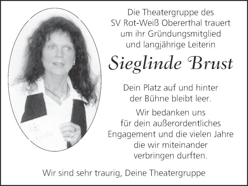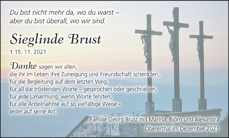 Hier finden Sie alle Traueranzeigen aus der Zeitung, die bisher für Sieglinde Brust erschienen sind. Weitere Traueranzeigen, die in der Zeitung erscheinen, werden hier ebenfalls aufgelistet