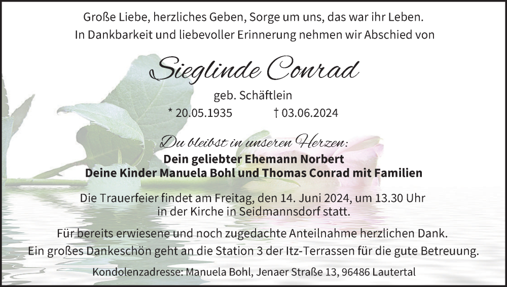 Hier finden Sie alle Traueranzeigen aus der Zeitung, die bisher für Sieglinde Conrad erschienen sind. Weitere Traueranzeigen, die in der Zeitung erscheinen, werden hier ebenfalls aufgelistet
