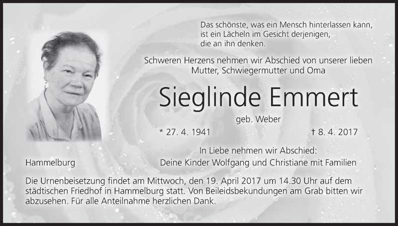 Hier finden Sie alle Traueranzeigen aus der Zeitung, die bisher für Sieglinde Emmert erschienen sind. Weitere Traueranzeigen, die in der Zeitung erscheinen, werden hier ebenfalls aufgelistet