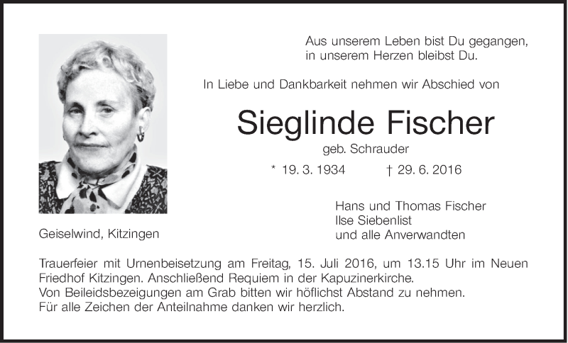 Hier finden Sie alle Traueranzeigen aus der Zeitung, die bisher für Sieglinde Fischer erschienen sind. Weitere Traueranzeigen, die in der Zeitung erscheinen, werden hier ebenfalls aufgelistet