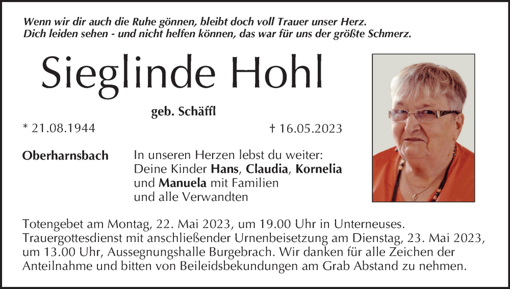 Hier finden Sie alle Traueranzeigen aus der Zeitung, die bisher für Sieglinde Hohl erschienen sind. Weitere Traueranzeigen, die in der Zeitung erscheinen, werden hier ebenfalls aufgelistet