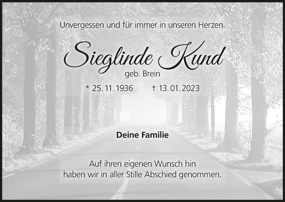 Hier finden Sie alle Traueranzeigen aus der Zeitung, die bisher für Sieglinde Kund erschienen sind. Weitere Traueranzeigen, die in der Zeitung erscheinen, werden hier ebenfalls aufgelistet