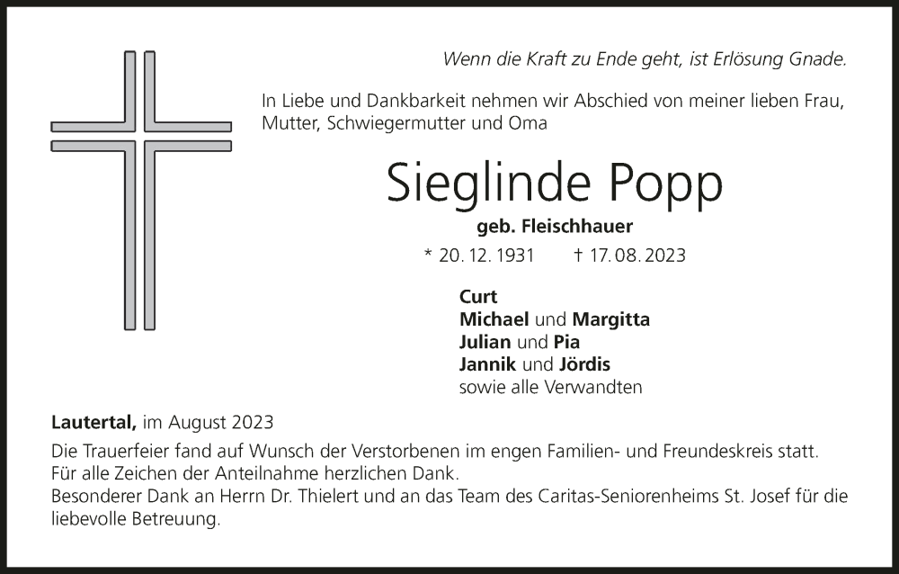 Hier finden Sie alle Traueranzeigen aus der Zeitung, die bisher für Sieglinde Popp erschienen sind. Weitere Traueranzeigen, die in der Zeitung erscheinen, werden hier ebenfalls aufgelistet