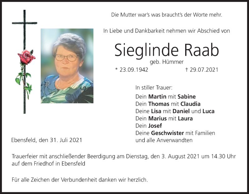 Hier finden Sie alle Traueranzeigen aus der Zeitung, die bisher für Sieglinde Raab erschienen sind. Weitere Traueranzeigen, die in der Zeitung erscheinen, werden hier ebenfalls aufgelistet