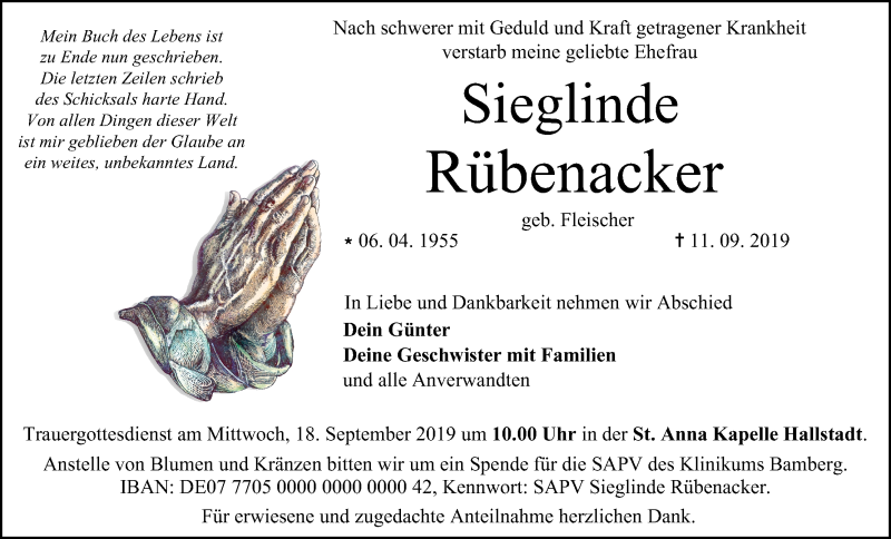 Hier finden Sie alle Traueranzeigen aus der Zeitung, die bisher für Sieglinde Rübenacker erschienen sind. Weitere Traueranzeigen, die in der Zeitung erscheinen, werden hier ebenfalls aufgelistet
