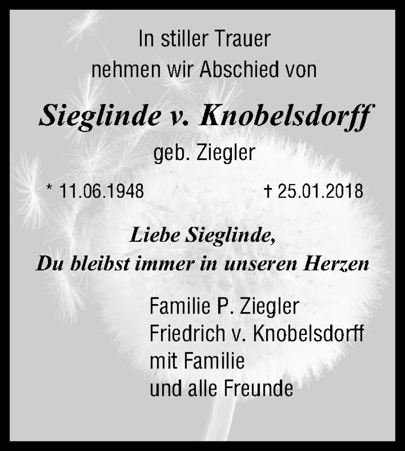 Hier finden Sie alle Traueranzeigen aus der Zeitung, die bisher für Sieglinde v. Knobelsdorff erschienen sind. Weitere Traueranzeigen, die in der Zeitung erscheinen, werden hier ebenfalls aufgelistet