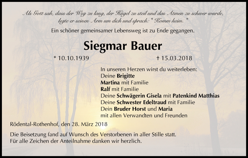 Hier finden Sie alle Traueranzeigen aus der Zeitung, die bisher für Siegmar Bauer erschienen sind. Weitere Traueranzeigen, die in der Zeitung erscheinen, werden hier ebenfalls aufgelistet