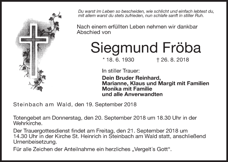 Hier finden Sie alle Traueranzeigen aus der Zeitung, die bisher für Siegmund Fröba erschienen sind. Weitere Traueranzeigen, die in der Zeitung erscheinen, werden hier ebenfalls aufgelistet