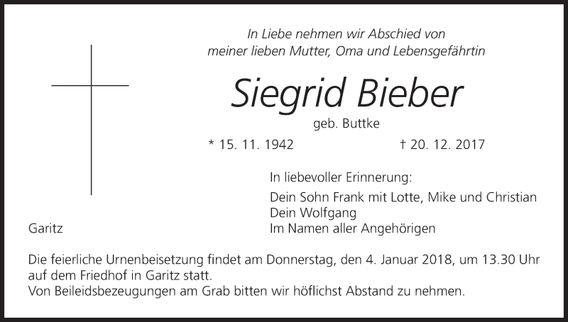 Hier finden Sie alle Traueranzeigen aus der Zeitung, die bisher für Siegrid Bieber erschienen sind. Weitere Traueranzeigen, die in der Zeitung erscheinen, werden hier ebenfalls aufgelistet