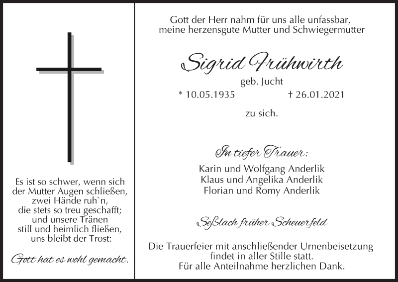 Hier finden Sie alle Traueranzeigen aus der Zeitung, die bisher für Sigrid Frühwirth erschienen sind. Weitere Traueranzeigen, die in der Zeitung erscheinen, werden hier ebenfalls aufgelistet