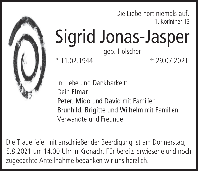 Hier finden Sie alle Traueranzeigen aus der Zeitung, die bisher für Sigrid Jonas-Jasper erschienen sind. Weitere Traueranzeigen, die in der Zeitung erscheinen, werden hier ebenfalls aufgelistet
