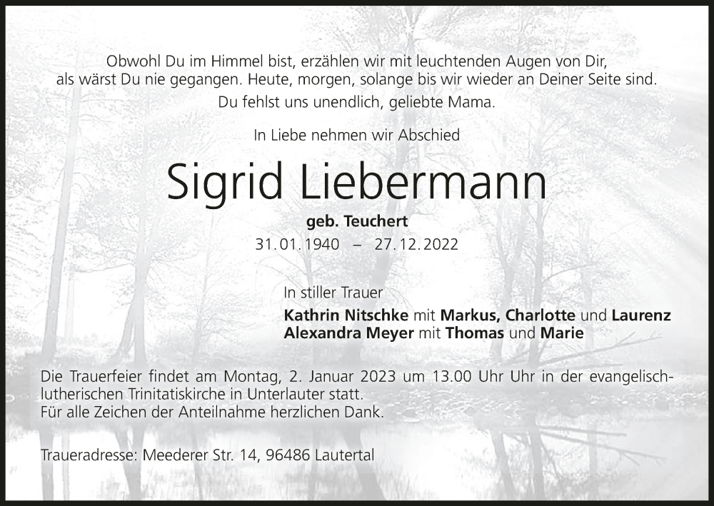 Hier finden Sie alle Traueranzeigen aus der Zeitung, die bisher für Sigrid Liebermann erschienen sind. Weitere Traueranzeigen, die in der Zeitung erscheinen, werden hier ebenfalls aufgelistet