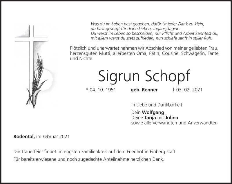 Hier finden Sie alle Traueranzeigen aus der Zeitung, die bisher für Sigrun Schopf erschienen sind. Weitere Traueranzeigen, die in der Zeitung erscheinen, werden hier ebenfalls aufgelistet