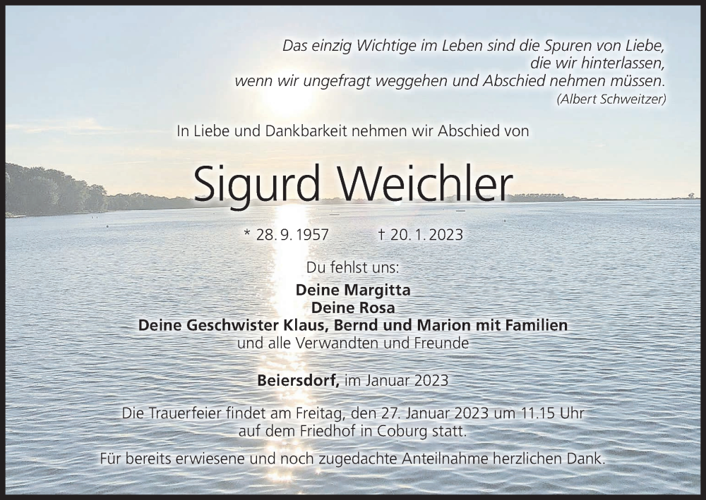 Hier finden Sie alle Traueranzeigen aus der Zeitung, die bisher für Sigurd Weichler erschienen sind. Weitere Traueranzeigen, die in der Zeitung erscheinen, werden hier ebenfalls aufgelistet