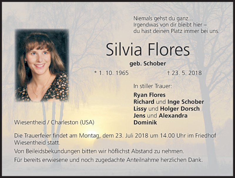 Hier finden Sie alle Traueranzeigen aus der Zeitung, die bisher für Silvia Flores erschienen sind. Weitere Traueranzeigen, die in der Zeitung erscheinen, werden hier ebenfalls aufgelistet