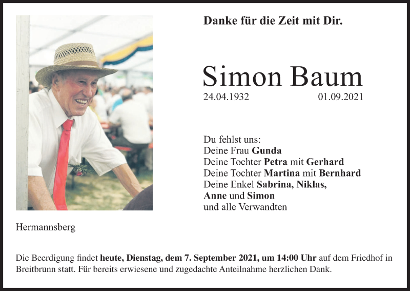 Hier finden Sie alle Traueranzeigen aus der Zeitung, die bisher für Simon Baum erschienen sind. Weitere Traueranzeigen, die in der Zeitung erscheinen, werden hier ebenfalls aufgelistet