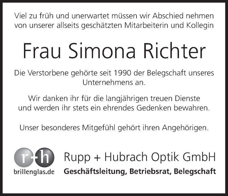 Hier finden Sie alle Traueranzeigen aus der Zeitung, die bisher für Simona Richter erschienen sind. Weitere Traueranzeigen, die in der Zeitung erscheinen, werden hier ebenfalls aufgelistet