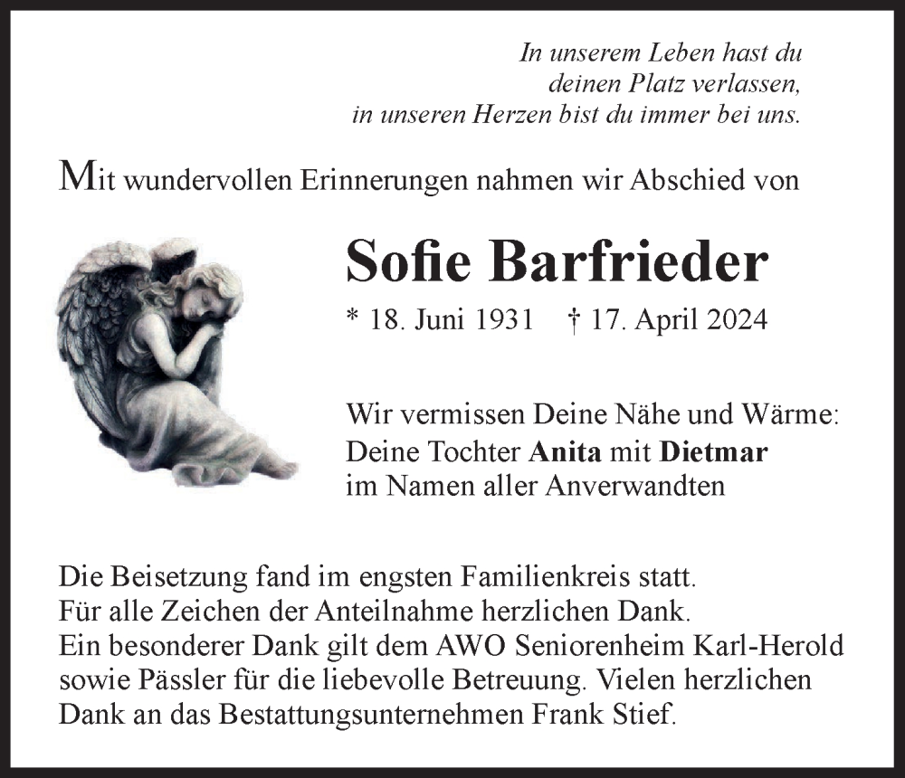 Hier finden Sie alle Traueranzeigen aus der Zeitung, die bisher für Sofie Barfrieder erschienen sind. Weitere Traueranzeigen, die in der Zeitung erscheinen, werden hier ebenfalls aufgelistet