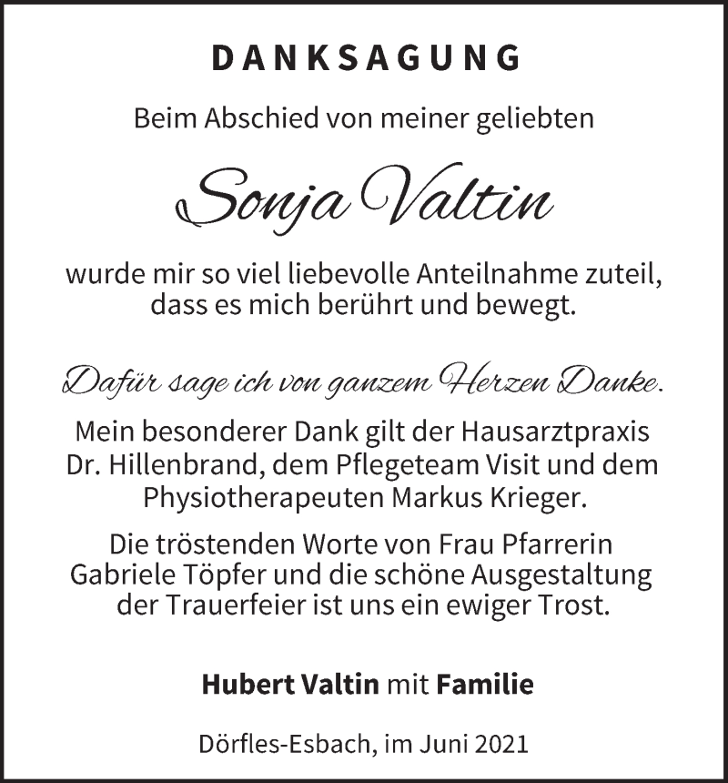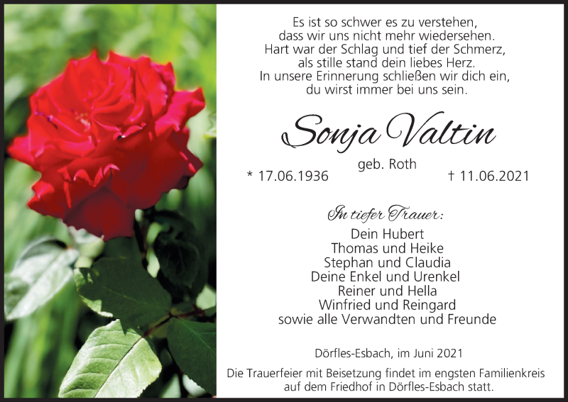 Hier finden Sie alle Traueranzeigen aus der Zeitung, die bisher für Sonja Valtin erschienen sind. Weitere Traueranzeigen, die in der Zeitung erscheinen, werden hier ebenfalls aufgelistet