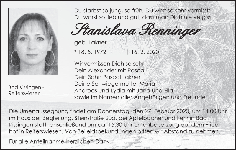 Hier finden Sie alle Traueranzeigen aus der Zeitung, die bisher für Stanislava Renninger erschienen sind. Weitere Traueranzeigen, die in der Zeitung erscheinen, werden hier ebenfalls aufgelistet