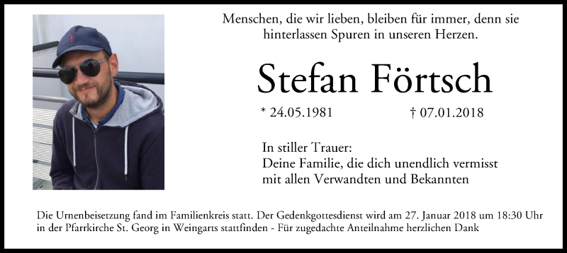Hier finden Sie alle Traueranzeigen aus der Zeitung, die bisher für Stefan Förtsch erschienen sind. Weitere Traueranzeigen, die in der Zeitung erscheinen, werden hier ebenfalls aufgelistet
