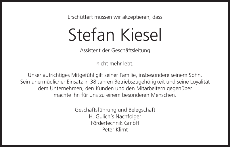 Hier finden Sie alle Traueranzeigen aus der Zeitung, die bisher für Stefan Kiesel erschienen sind. Weitere Traueranzeigen, die in der Zeitung erscheinen, werden hier ebenfalls aufgelistet