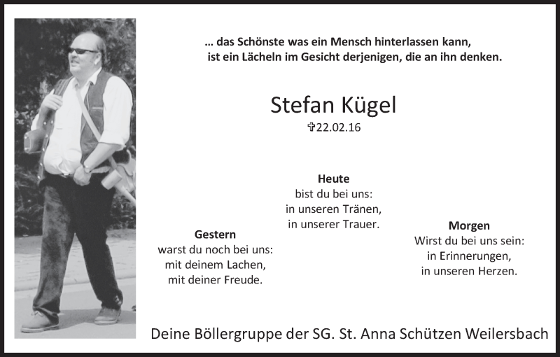 Hier finden Sie alle Traueranzeigen aus der Zeitung, die bisher für Stefan Kügel erschienen sind. Weitere Traueranzeigen, die in der Zeitung erscheinen, werden hier ebenfalls aufgelistet