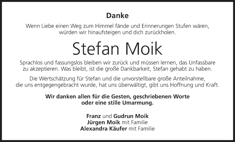 Hier finden Sie alle Traueranzeigen aus der Zeitung, die bisher für Stefan Moik erschienen sind. Weitere Traueranzeigen, die in der Zeitung erscheinen, werden hier ebenfalls aufgelistet