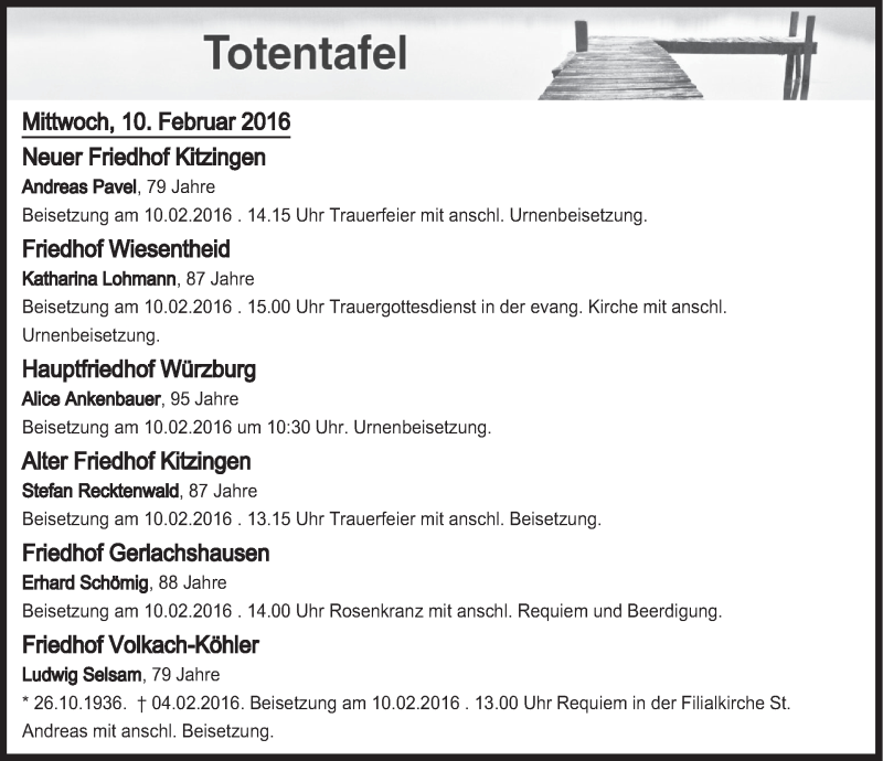Hier finden Sie alle Traueranzeigen aus der Zeitung, die bisher für Sterbetafel vom 09.02.2016 erschienen sind. Weitere Traueranzeigen, die in der Zeitung erscheinen, werden hier ebenfalls aufgelistet