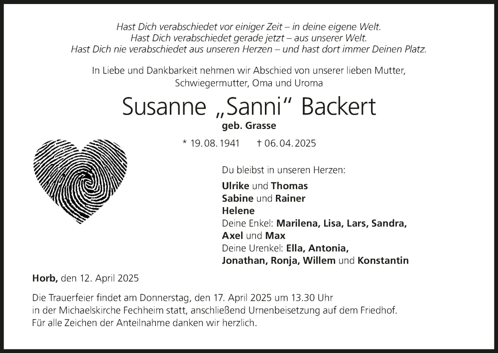 Hier finden Sie alle Traueranzeigen aus der Zeitung, die bisher für Susanne Backert erschienen sind. Weitere Traueranzeigen, die in der Zeitung erscheinen, werden hier ebenfalls aufgelistet