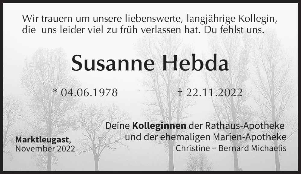 Hier finden Sie alle Traueranzeigen aus der Zeitung, die bisher für Susanne Hebda erschienen sind. Weitere Traueranzeigen, die in der Zeitung erscheinen, werden hier ebenfalls aufgelistet