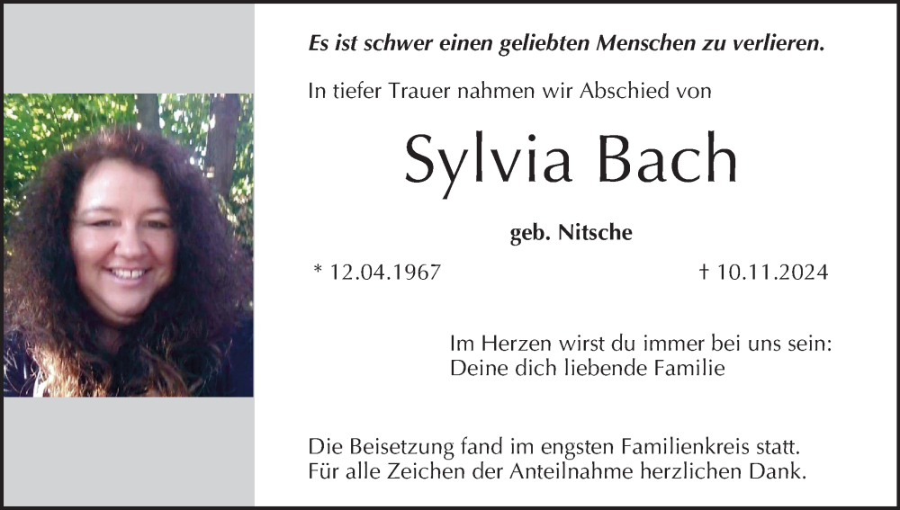 Hier finden Sie alle Traueranzeigen aus der Zeitung, die bisher für Sylvia Bach erschienen sind. Weitere Traueranzeigen, die in der Zeitung erscheinen, werden hier ebenfalls aufgelistet