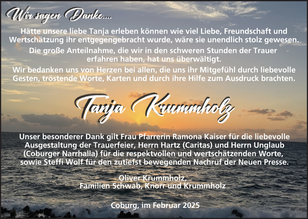 Hier finden Sie alle Traueranzeigen aus der Zeitung, die bisher für Tanja Krummholz erschienen sind. Weitere Traueranzeigen, die in der Zeitung erscheinen, werden hier ebenfalls aufgelistet