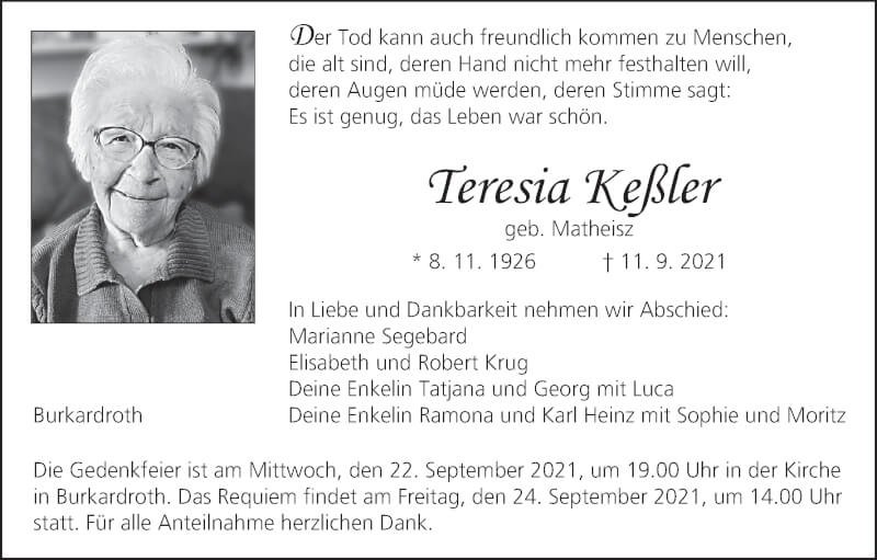 Hier finden Sie alle Traueranzeigen aus der Zeitung, die bisher für Teresia Keßler erschienen sind. Weitere Traueranzeigen, die in der Zeitung erscheinen, werden hier ebenfalls aufgelistet
