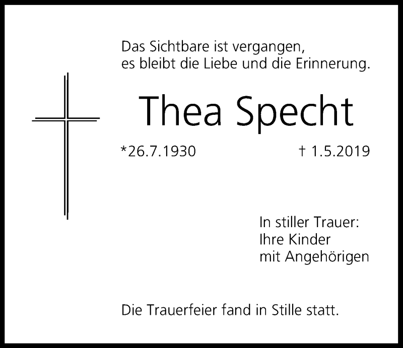 Hier finden Sie alle Traueranzeigen aus der Zeitung, die bisher für Thea Specht erschienen sind. Weitere Traueranzeigen, die in der Zeitung erscheinen, werden hier ebenfalls aufgelistet