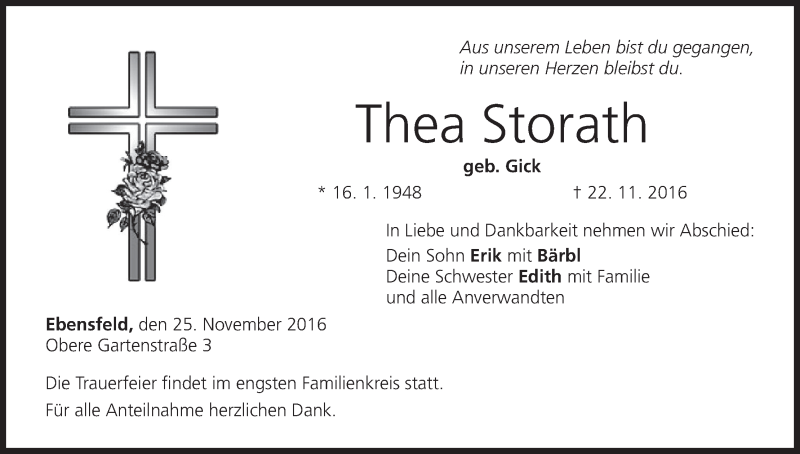 Hier finden Sie alle Traueranzeigen aus der Zeitung, die bisher für Thea Storath erschienen sind. Weitere Traueranzeigen, die in der Zeitung erscheinen, werden hier ebenfalls aufgelistet