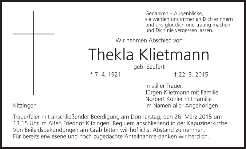 Hier finden Sie alle Traueranzeigen aus der Zeitung, die bisher für Thekla Klietmann erschienen sind. Weitere Traueranzeigen, die in der Zeitung erscheinen, werden hier ebenfalls aufgelistet
