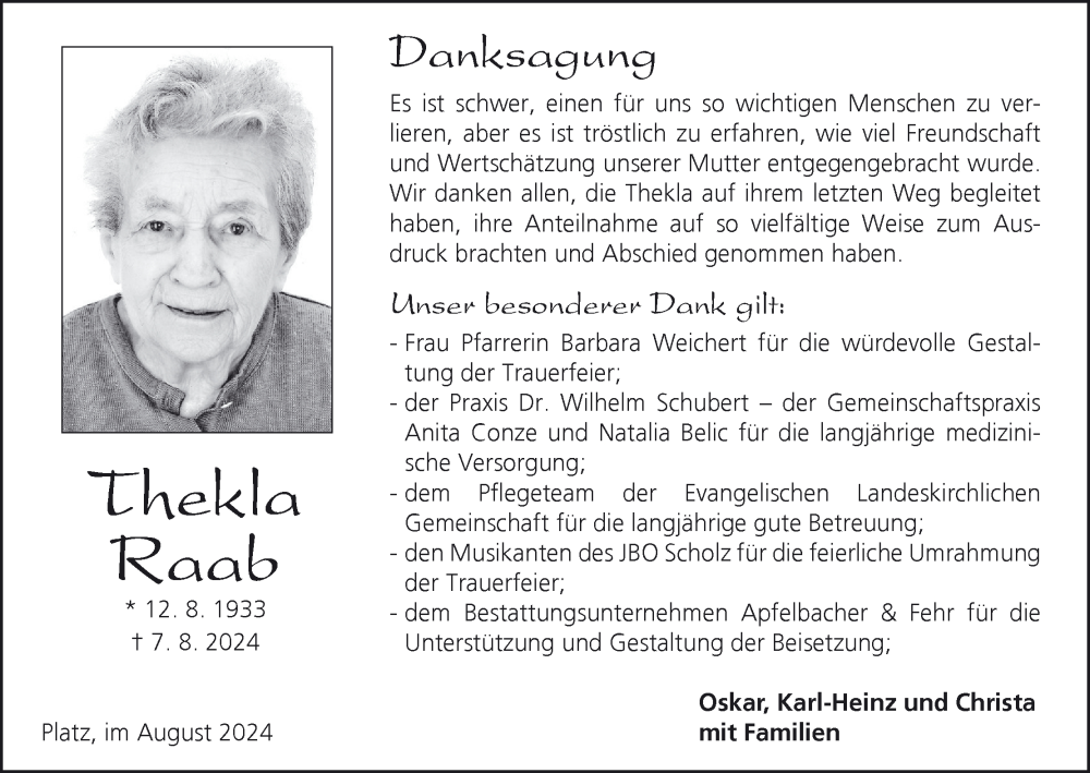 Hier finden Sie alle Traueranzeigen aus der Zeitung, die bisher für Thekla Raab erschienen sind. Weitere Traueranzeigen, die in der Zeitung erscheinen, werden hier ebenfalls aufgelistet