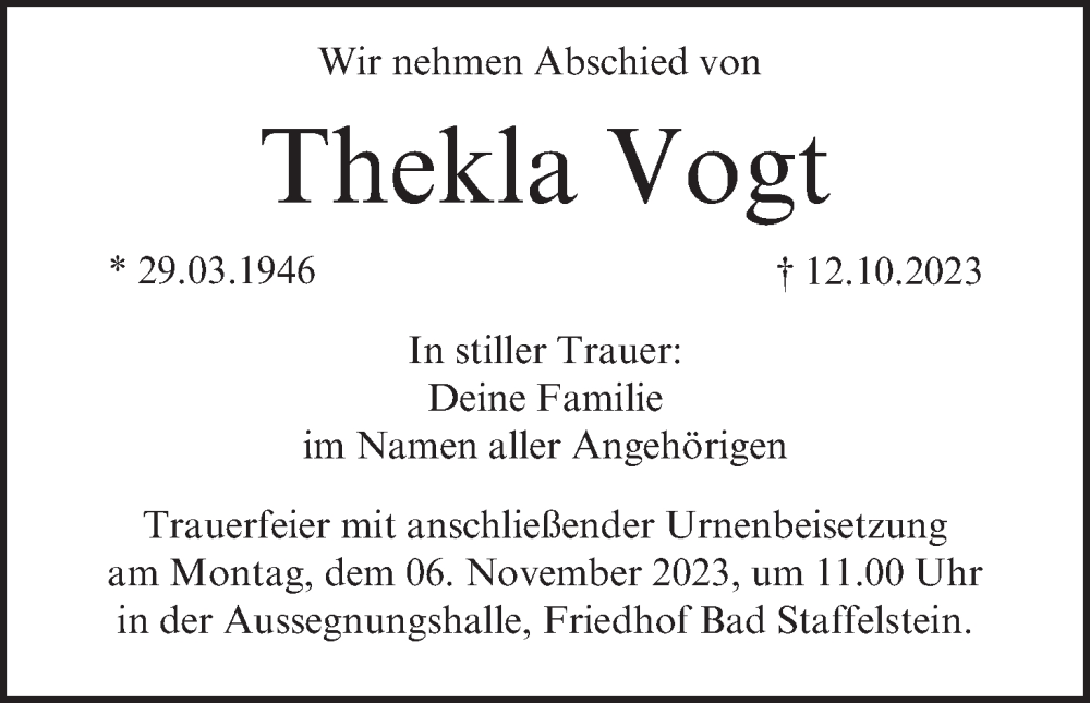 Hier finden Sie alle Traueranzeigen aus der Zeitung, die bisher für Thekla Vogt erschienen sind. Weitere Traueranzeigen, die in der Zeitung erscheinen, werden hier ebenfalls aufgelistet