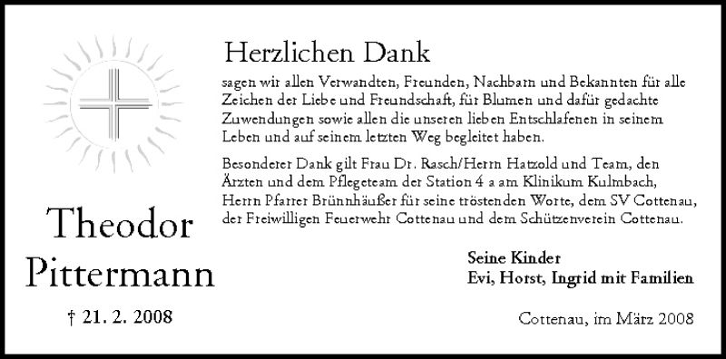 Hier finden Sie alle Traueranzeigen aus der Zeitung, die bisher für Theodor Pittermann erschienen sind. Weitere Traueranzeigen, die in der Zeitung erscheinen, werden hier ebenfalls aufgelistet