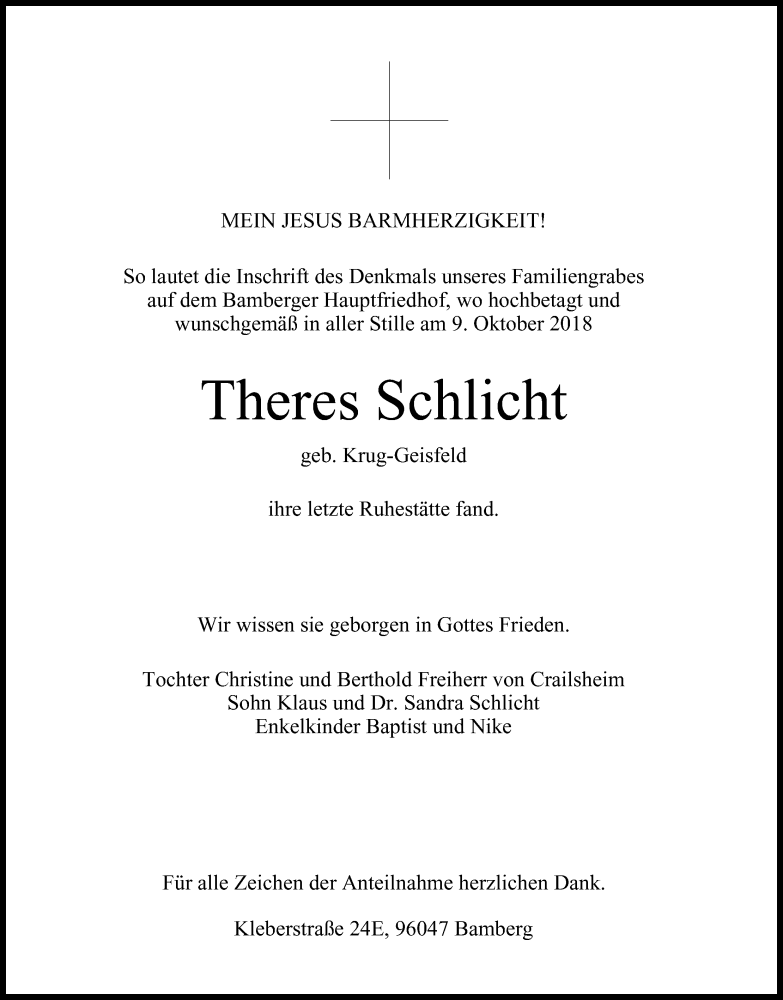 Hier finden Sie alle Traueranzeigen aus der Zeitung, die bisher für Theres Schlicht erschienen sind. Weitere Traueranzeigen, die in der Zeitung erscheinen, werden hier ebenfalls aufgelistet