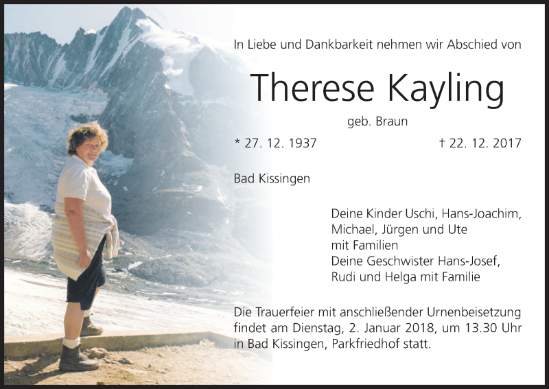 Hier finden Sie alle Traueranzeigen aus der Zeitung, die bisher für Therese Kayling erschienen sind. Weitere Traueranzeigen, die in der Zeitung erscheinen, werden hier ebenfalls aufgelistet
