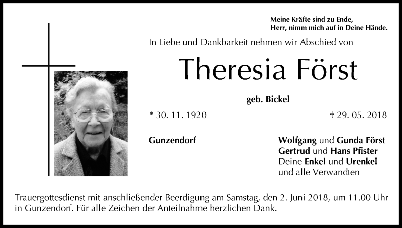 Hier finden Sie alle Traueranzeigen aus der Zeitung, die bisher für Theresia Först erschienen sind. Weitere Traueranzeigen, die in der Zeitung erscheinen, werden hier ebenfalls aufgelistet