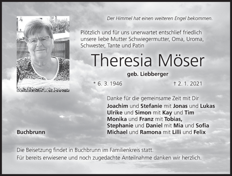 Hier finden Sie alle Traueranzeigen aus der Zeitung, die bisher für Theresia Möser erschienen sind. Weitere Traueranzeigen, die in der Zeitung erscheinen, werden hier ebenfalls aufgelistet