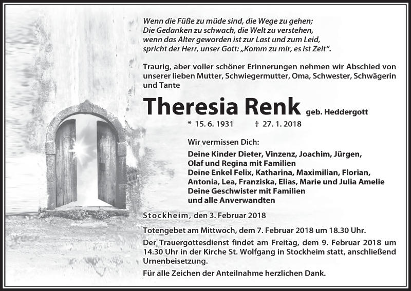 Hier finden Sie alle Traueranzeigen aus der Zeitung, die bisher für Theresia Renk erschienen sind. Weitere Traueranzeigen, die in der Zeitung erscheinen, werden hier ebenfalls aufgelistet