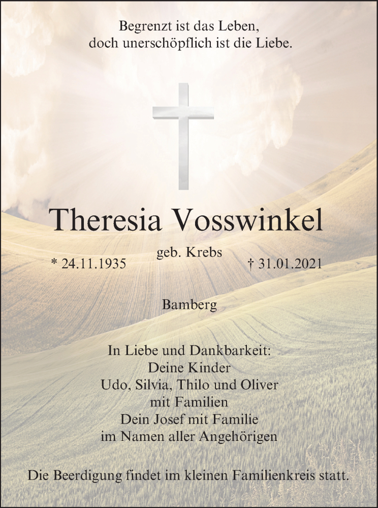 Hier finden Sie alle Traueranzeigen aus der Zeitung, die bisher für Theresia Vosswinkel erschienen sind. Weitere Traueranzeigen, die in der Zeitung erscheinen, werden hier ebenfalls aufgelistet