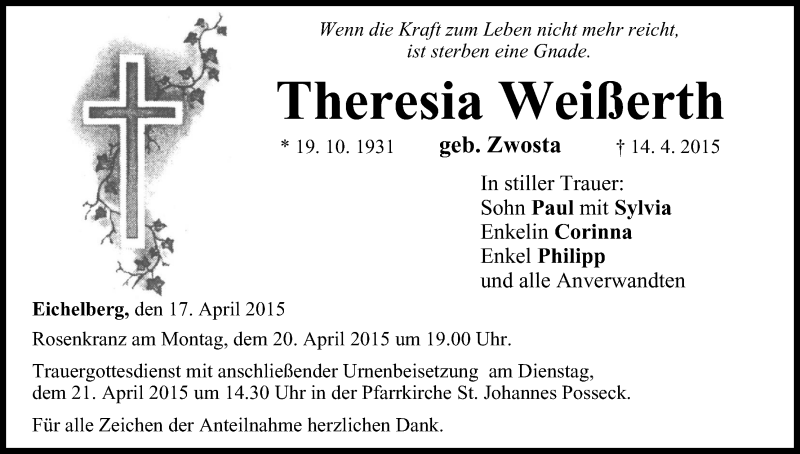 Hier finden Sie alle Traueranzeigen aus der Zeitung, die bisher für Theresia Weißerth erschienen sind. Weitere Traueranzeigen, die in der Zeitung erscheinen, werden hier ebenfalls aufgelistet