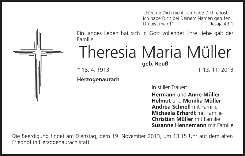Hier finden Sie alle Traueranzeigen aus der Zeitung, die bisher für Theresia Maria Müller erschienen sind. Weitere Traueranzeigen, die in der Zeitung erscheinen, werden hier ebenfalls aufgelistet