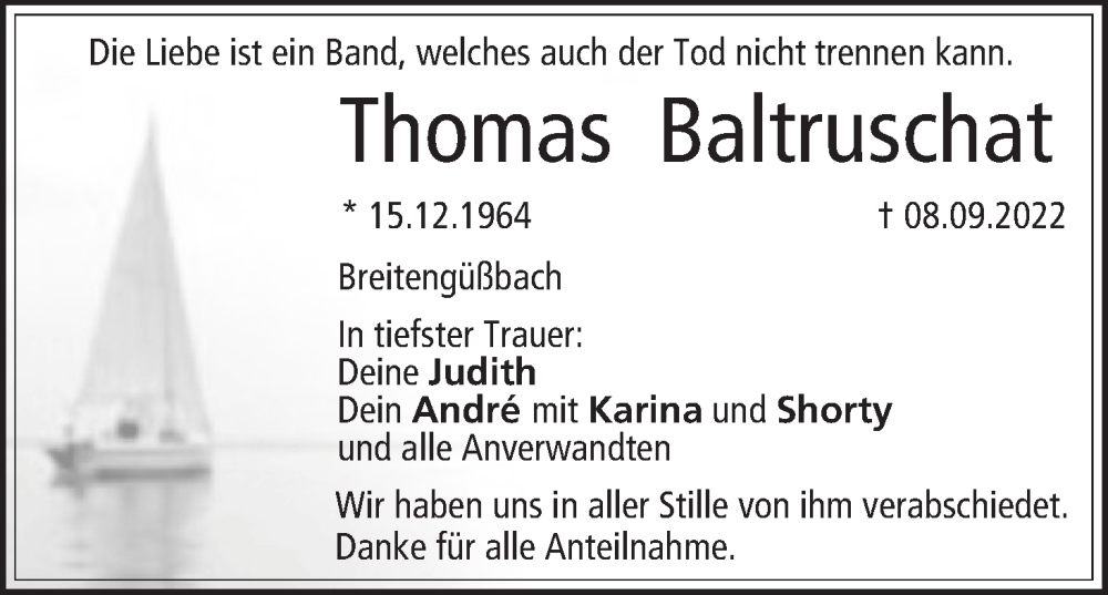 Hier finden Sie alle Traueranzeigen aus der Zeitung, die bisher für Thomas Baltruschat erschienen sind. Weitere Traueranzeigen, die in der Zeitung erscheinen, werden hier ebenfalls aufgelistet
