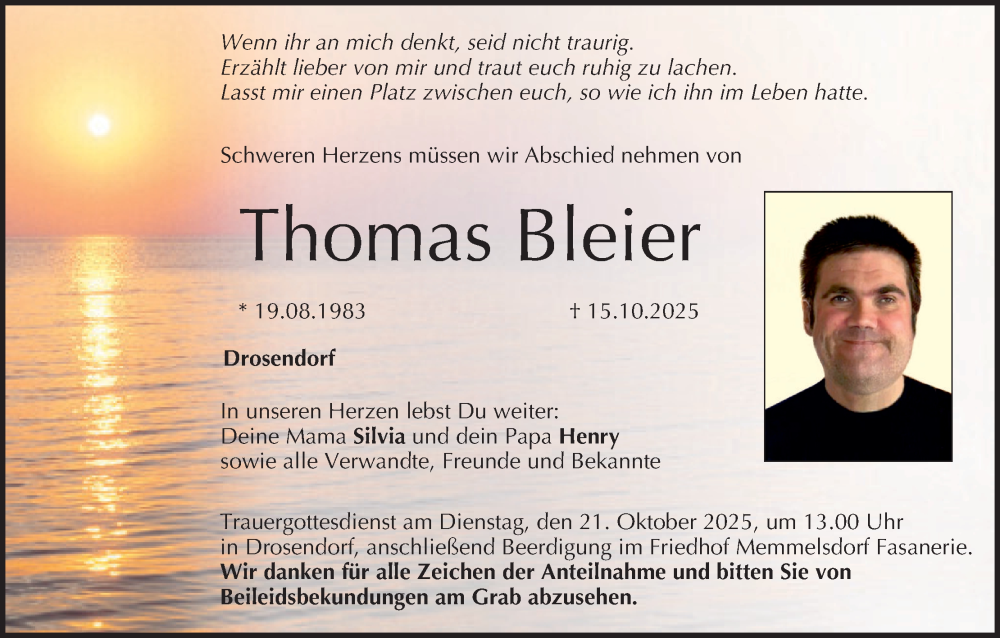 Hier finden Sie alle Traueranzeigen aus der Zeitung, die bisher für Thomas Bleier erschienen sind. Weitere Traueranzeigen, die in der Zeitung erscheinen, werden hier ebenfalls aufgelistet